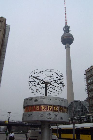 This is the World Time Clock in Alexanderplatz, East Berlin. Kinda neat. The "TV" tower in the back is ugly on the outside, but is worth the elevator ride to the top for a really great view of the city.
