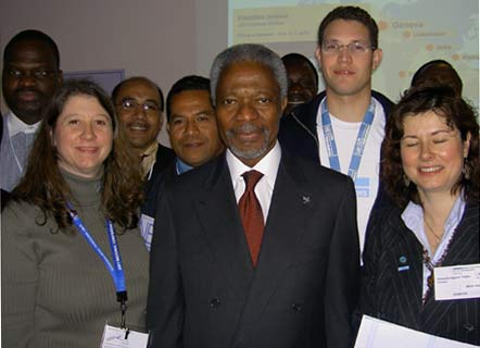 We all beamed as though we were stoned out of our minds (I looked awful but, still, I beamed). He came in and I think I mouthed the word "welcome", but I couldn't really speak -- my voice was gone. The small mob filled our center and completely encircled us, and there was almost a hysteria in the air. It was impossible to talk to him, even if you were right next to him -- everyone was competing for his attention. Someone called for a picture with the UNV staff. So we all squeezed in around him, and he said, "Quickly, quickly." And there was a sudden quiet as everyone focused their cameras, and I thought to myself, self, if you wanted to speak to him, say it now. So I said, in a voice that carried over the shuffling and clicking while we all stared at the cameras, "Mr. Annan, when you are no longer Secretary General, you could be an online volunteer yourself." He laughed, in that way it shows someone has taken by surprise, turned towards me as he walked away and said, "Right."