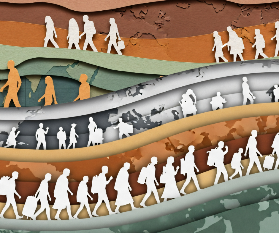 white outlines of human figures with luggage, on the move, trekking across various landscapes